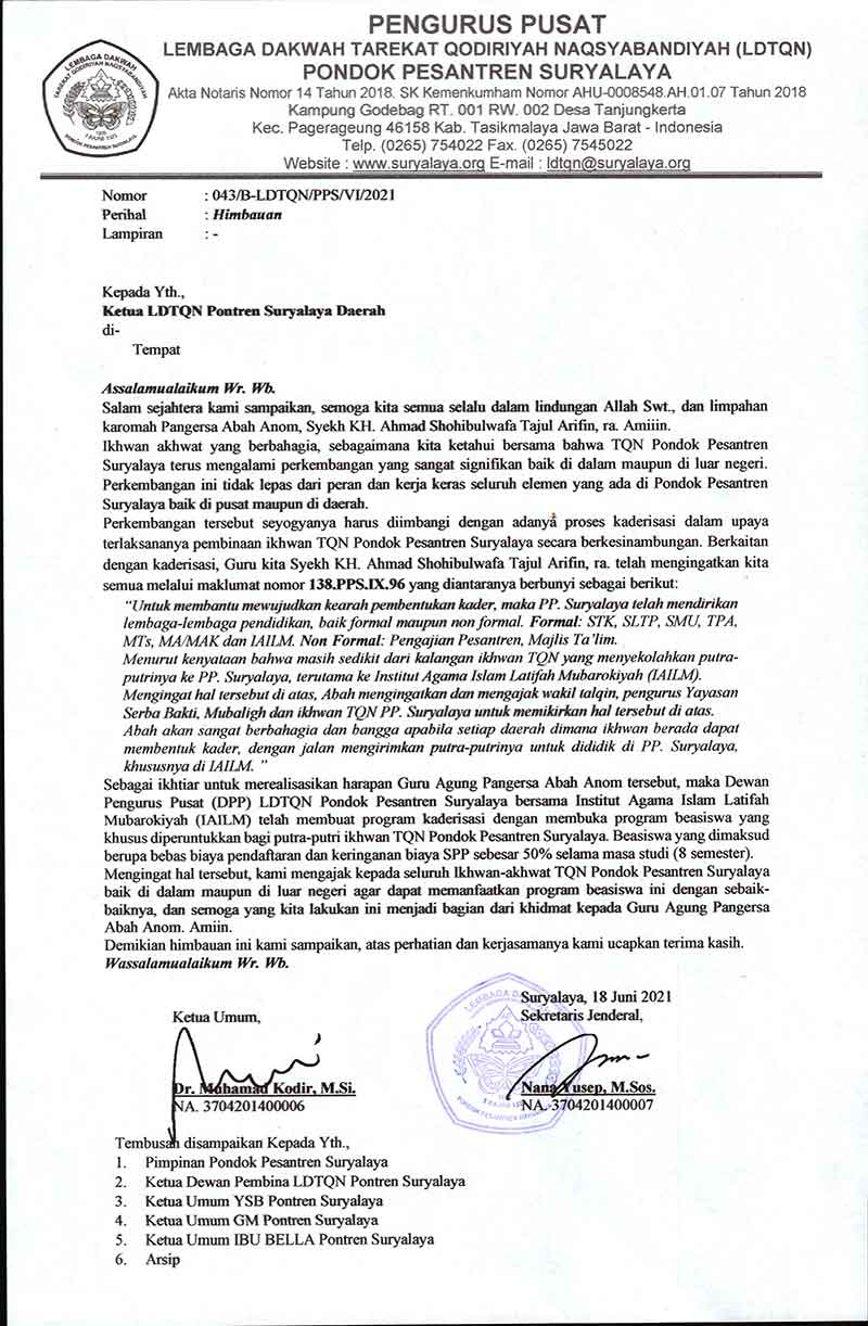 “Kami mengajak kepada seluruh Ikhwan-akhwat TQN Pondok Pesantren Suryalaya baik di dalam maupun di luar negeri agar dapat memanfaatkan program beasiswa ini dengan sebaik-baiknya, dan semoga yang kita lakukan ini menjadi bagian dari khidmat kepada Guru Agung Pangersa Abah Anom. Amiin,” demikian imbauan surat bernomor Nomor: 043/B-LDTQN/PPS/VI/2021 yang ditandatangani oleh Ketua Umum LDTQN Dr. Muhammad Kodir, M.Si. dan Sekretaris Jenderal, Nana Yusep, M.Sos. []