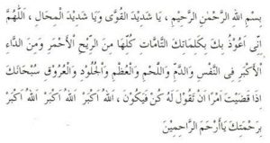 “Dengan nama Allah Yang Maha Pengasih lagi Maha Penyayang. Wahai Yang Maha Kuat, wahai Yang Maha Menempatkan. Ya Allah, aku berlindung kepada-Mu dengan kalimat-Mu yang sempurna dari angin merah dan dari penyakit yang besar di jiwa, darah, daging, tulang dan urat. Maha Suci Engkau apabila memutuskan sesuatu hanyalah berkata kepadanya, ‘Jadilah’ maka ‘jadilah ia’, Allah Maha Besar 3x, dengan rahmat-Mu wahai Yang Maha Penyayang diantara penyayang. [Han]