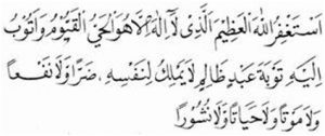 Saya memohon ampun kepada Allah Yang Maha Agung. Saya mengakui bahwa tidak ada Tuhan selain Allah. Tuhan Yang Hidup terus dan berdiri dengan sendiri-Nya. Saya mohon taubat selaku seorang hamba yang banyak berbuat dosa, yang tidak mempunyai daya upaya apa-apa untuk berbuat mudharat atau manfaat untuk mati atau hidup maupun bangkit nanti.